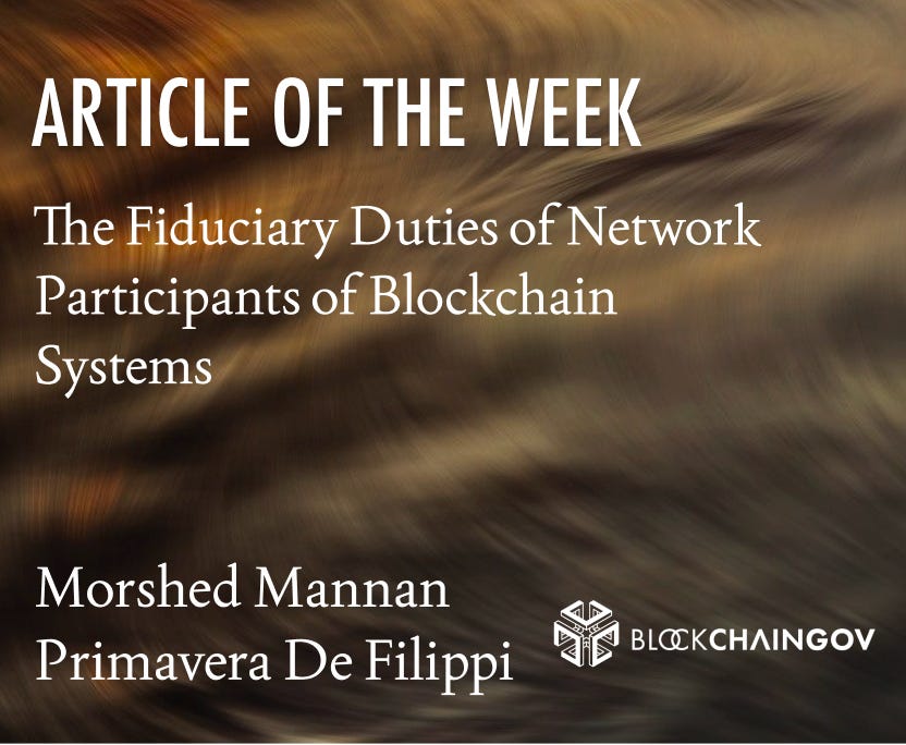 The Fiduciary Duties of Network Participants of Blockchain Systems” — In their chapter in Oxford University Press’s Foundations of Decentralized Organizations, Morshed Mannan and Primavera De Filippi ask whether blockchain developers should owe fiduciary duties to users. As DAOs mature and draw increasing regulatory attention, there is growing pressure to extend traditional trust-based obligations to developers and network participants. Mannan and De Filippi argue against. Their case rests on regulatory equivalence: blockchain’s native transparency and governance mechanisms can deliver functionally equivalent protections without retrofitting legal frameworks designed for intermediary-based systems. Imposing default fiduciary duties, they argue, risks constraining innovation and fundamentally misreading how decentralized systems operate.