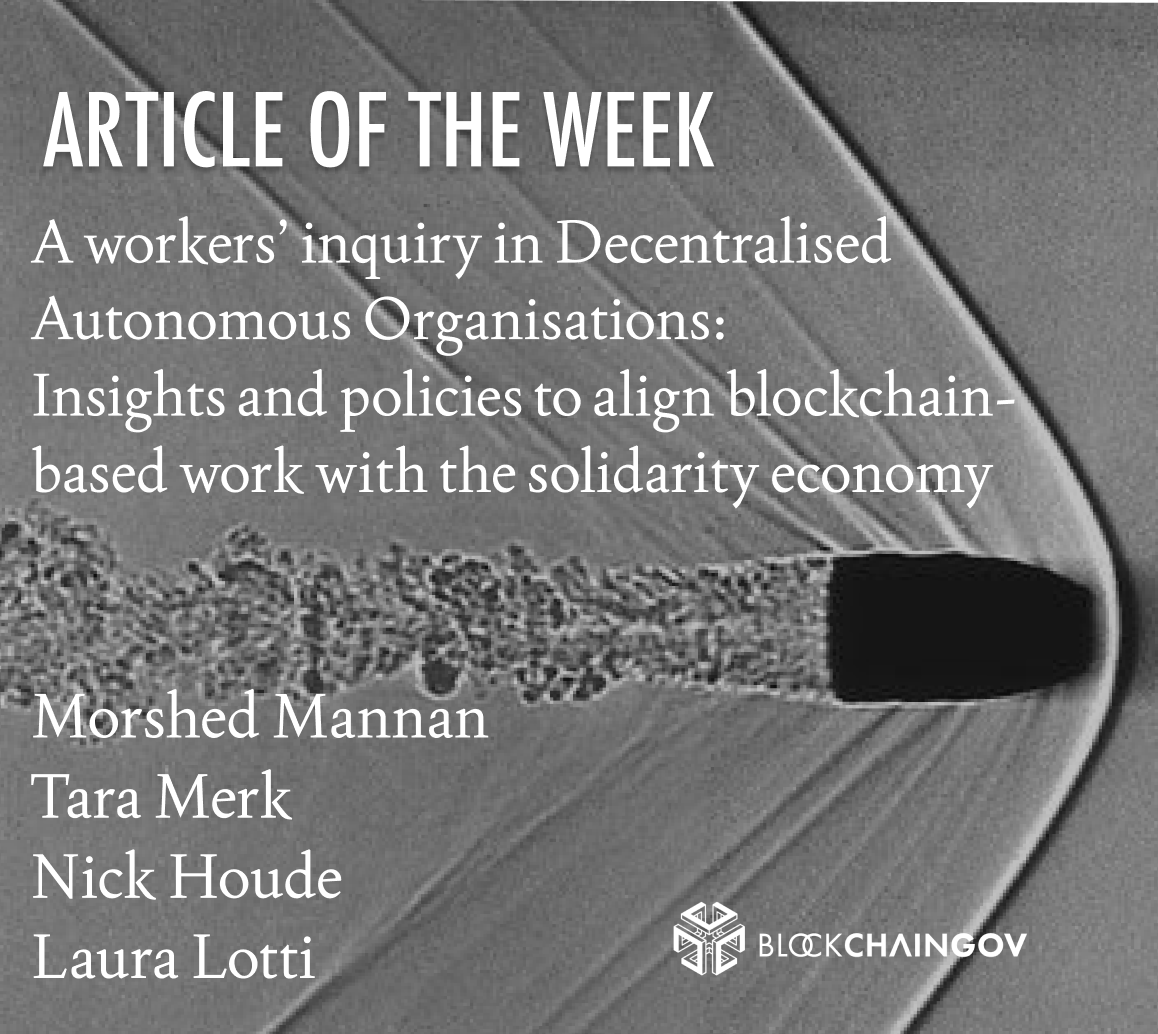 “A Workers’ Inquiry in Decentralised Autonomous Organisations” — This study by Tara Merk, Morshed Mannan, Nick Houde and Laura Lotti offers the first comprehensive empirical account of working conditions in DAOs(very exciting!!). Drawing on ethnographic research with 38 contributors, the authors find that while many imagine DAOs as cooperative alternatives to traditional firms, token governance in practice can tend to replicate shareholder capitalism - actually incentivizing self-exploitation under the banner of decentralization. The study identifies three areas where DAO labour falls short of its solidarity economy promise: psychosocial security, financial predictability, and regulatory clarity. Their proposed intervention: “interfaces” — institutional bridges connecting DAO participants to existing social protections and public infrastructure.